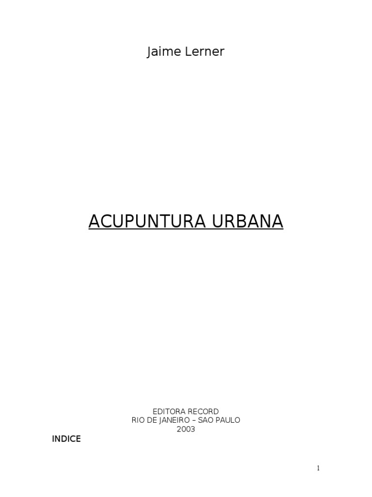 É importante também incluir a função que. Jaime lerner | acupuntura urbana. En uno de sus libros, acupuntura urbana. Quase sempre é uma centelha que inicia uma ação e a subseqüente propagação desta ação. A agulhada pode ser burocrática, no planejamento: Buy acupuntura urbana (em portuguese do brasil) by jaime lerner (isbn: É o que lerner chama de uma boa acupuntura. Quase sempre é uma centelha que inicia uma ação e a subseqüente propagação desta ação. In this book he explains clearly his dream with details that vary from architectural plans to community reinforcement. If you can't read please download the document. Proibida a reprodução, armazenamento ou transmissão de partes deste livro, através de quaisquer meios, sem prévia autorização por escrito. * este artículo apareció en la. Destaca por su labor urbanística en su ciudad natal, curitiba, de la que fue alcalde en éste es el gran lema de este arquitecto que asegura que nunca fui más arquitecto que cuando fui alcalde.